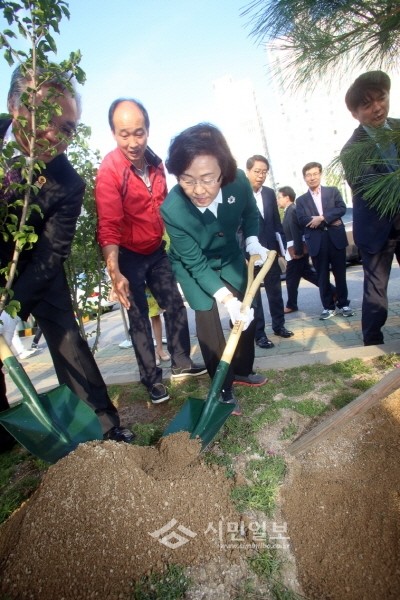 서울 강남구는 최근 구청에서 ‘충북 보은군 정이품송 기념식수 전달식’을 개최했다. 사진은 이날 행사에 참석한 신연희 구청장(가운데)이 시삽을 하고 있는 모습.(사진제공=강남구청)