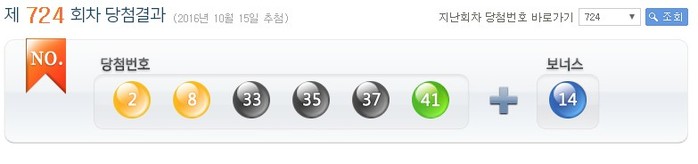 한편 로또 724회차 당첨 번호는 2, 8, 33, 35, 37, 41에 보너스 번호는 14이다.