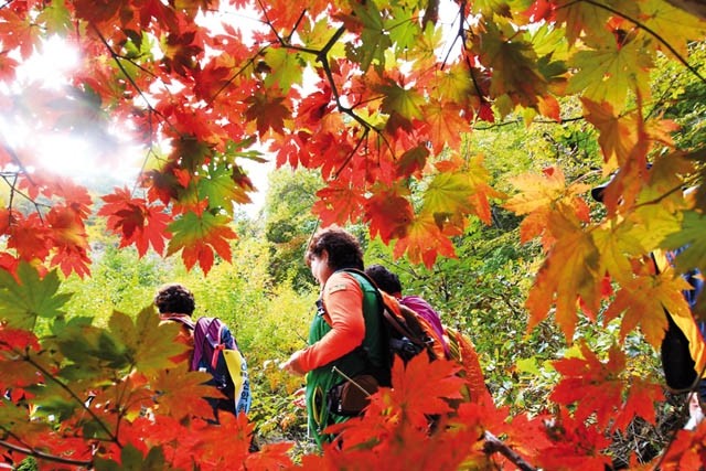 설악산 단풍이 절정기에 접어든 16일 남설악 오색지구 주전골 탐방로에서 등산객들이 산행을 즐기고 있다.