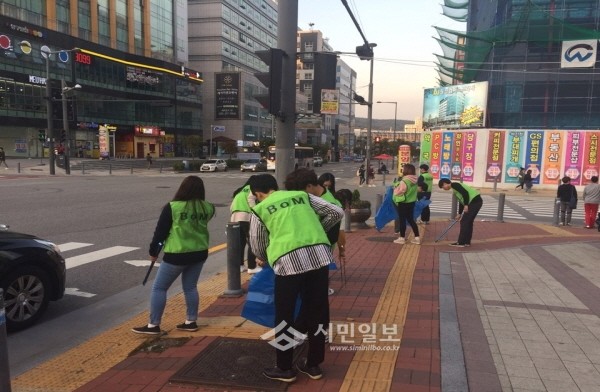 지난 14일 경기 수원시 영통구 광교1동은 경기대학교 동아리(BOM) 회원들과 함께 광교1동 대학로에서 '환경정화 활동'을 실시했다. 사진은 참여자들이 쓰레기를 줍는 모습.(사진제공=영통구청)