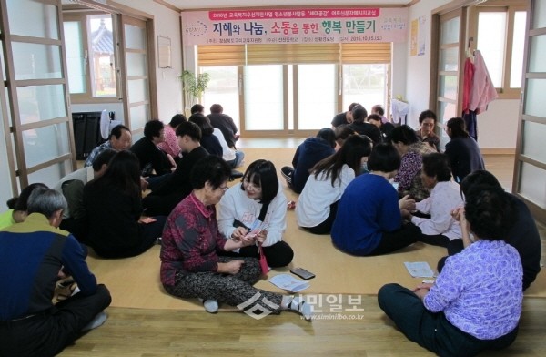 지난 15일 경북 구미교육지원청은 형곡중 및 선산중 학생 40명과 형남 및 상황경로당 노인 50명 등 90명을 대상으로 '세대공감' 청소년봉사활동 '어르신문자메시지교실'을 실시했다. 사진은 학생들이 노인들에게 휴대폰 사용방법에 대해 설명하는 모습.(사진제공=구미교육지원청)