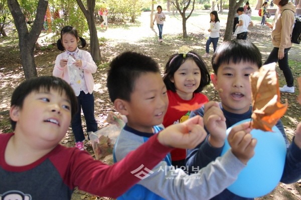 최근 경기 가평군 청평초등학교 2학년생들은 강원도립화목원을 방문해 주제별 체험학습을 실시했다. 사진은 학생들이 나뭇잎을 들고 즐거워하는 모습.(사진제공=가평교육지원청)