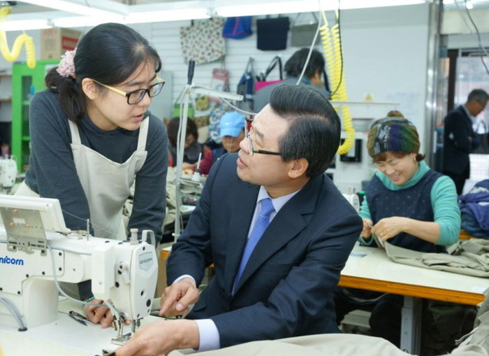 | ▲ 성장현 구청장이 장애인보호작업장을 찾아 봉제작업에 대해 관계자로부터 설명을 듣고 있다. | ||