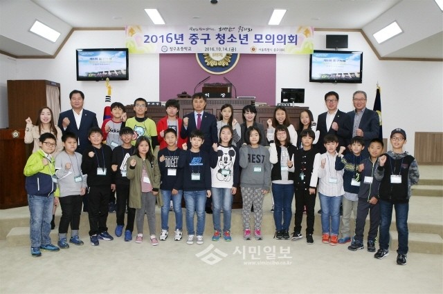 | ▲ 청소년 모의의회에 참석한 청구초등학교 5학년 학생 및 담임선생님과 구의원들이 함께 기념촬영을 하고 있다.(사진제공=중구의회) | ||