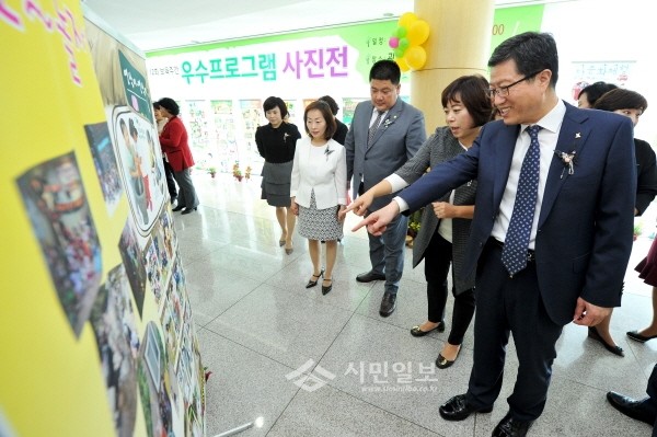 경기 광주시는 최근 시청 대회의실에서 어린이집원장과 보육교사 등 1000여명이 참석한 가운데 '제12회 보육주간행사'를 개최했다. 사진은 이희원 부시장(맨 오른쪽)이 우수 프로그램 사진전을 둘러보는 모습.(사진제공=광주시청)