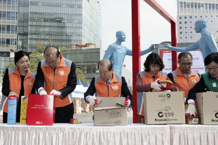 19일 박홍섭 마포구청장은 상암동 MBC 문화광장에서 열린 'MBC 맛있는 나눔, 푸드뱅크 페스티벌' 기념식에 참석했다. 사진은 박 구청장(왼쪽에서 세번째)이 참석자들과 함께 푸드뱅크 꾸러미를 만들고 있는 모습.(사진제공=마포구청)
