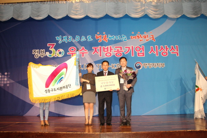지난 18일 성동구도시관리공단이 경북 경주시에서 개최된 '정부3.0 우수 지방공기업 시상식'에서 행정자치부가 주관하는 '2015년 정부 3.0 평가 우수기관'으로 선정돼 국무총리 표창을 수상했다. 사진은 공단 관계자들이 기념촬영하는 모습.(사진제공=성동구도시관리공단)