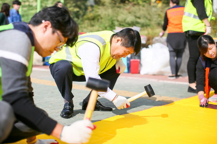 최근 인천 계양구는 인천효성서초등학교 근처 횡단보도에 아동의 통학 안전을 돕는 '옐로카펫'을 설치했다. 사진은 행사에 참여한 박형우 구청장(가운데)이 설치작업을 진행하고 있는 모습.(사진제공=계양구청)