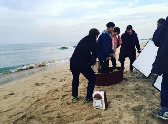 사진 속 두 사람은 MBC 수목드라마 '쇼핑왕 루이'를 촬영하던 중 바닷가에서 추위를 염려한 제작진이 따듯한 물이 담긴 대야를 제공, 그 속에 발을 담그고 있었다.