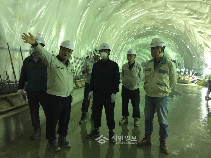 최근 경기 김포시는 김포골드라인 지하철공사 현장 및 차량제작사에서 공기의 적정성과 안전관리실태 등을 일제 점검했다. 사진은 관계자들이 터널 공사현장에서 시찰을 진행하는 모습.(사진제공=김포시청)