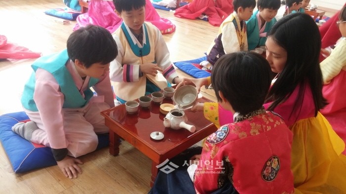 최근 경기 부천시 성곡초등학교는 바른 성품을 기르고 올바른 예절을 생활화하기 위해 전교생을 대상으로 전통예절교육을 실시했다. 사진은 한복을 차려입은 학생들이 다례 체험을 하고 있는 모습.(사진제공=성곡초등학교)