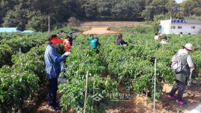 경기 여주시 점동면의 자매결연지인 서울 성동구 왕십리2동의 12개 기관·단체 관계자들이 최근 면을 찾아 농촌 일손 돕기 봉사활동을 실시했다. 사진은 관계자들이 고추밭에서 일손을 돕고 있는 모습.(사진제공=여주시청)