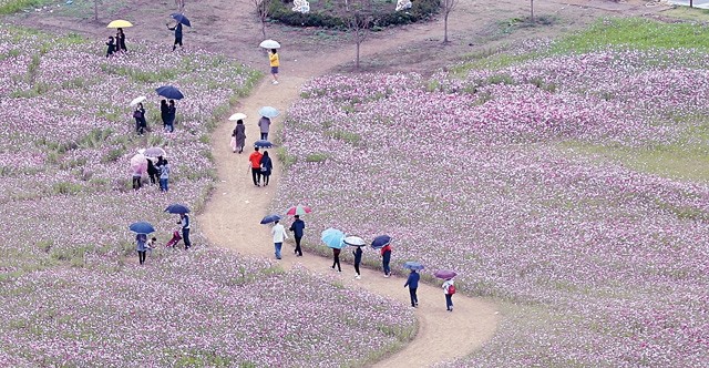 23일 오후 경기도 수원시 영통구 이의동 경기도청 신청사 부지를 찾은 시민들이 가을비가 내리는 코스모스길을 걷고 있다.