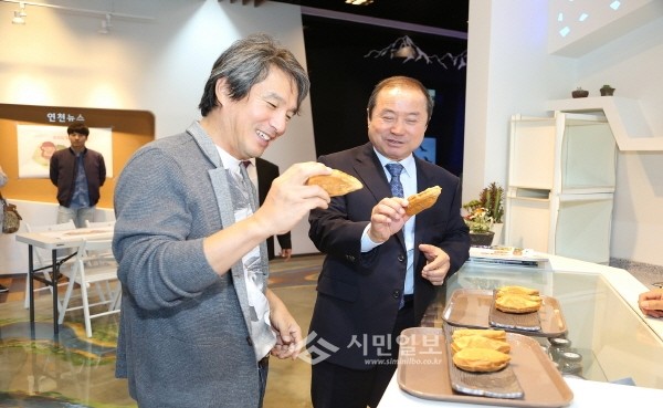 최근 경기 연천군은 연천 전곡리 유적 방문자센터에서 평화누리길 홍보대사인 영화배우 조재현씨와 ‘평화누리길 테마카페 조성을 위한 업무협력 협약’을 체결했다. 사진은 김규선 군수(오른쪽)와 조씨가 함께 방문자센터를 둘러보는 모습.(사진제공=연천군청)