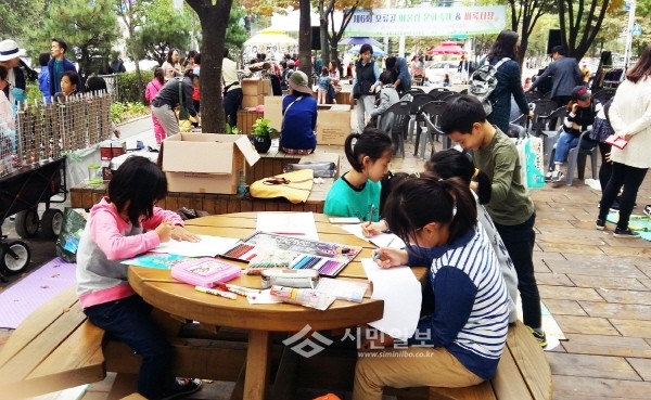 최근 서울 구로구 오류2동 소공원에서 지역주민 1000여명을 대상으로 진행된 ‘제6회 오류골 어울림 문화축제’의 백일장과 사생대회에 참가한 아이들이 원형 테이블에서 글짓기와 그림그리기를 하고 있다.(사진제공=구로구청)