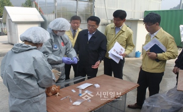 최근 세종시가 구제역·조류인플루엔자(AI) 특별방역기간을 맞아 전동면 양계농장에서 '현장방역 실태점검 및 대책회의'를 열었다. 사진은 한경호 행정부시장(가운데)이 관계자들과 이야기를 나누는 모습.(사진제공=세종시청)
