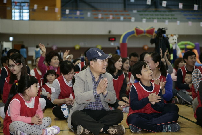 최근 박홍섭 마포구청장은 지역내 염리생활체육회관에서 열린 '2016 오! 마이 패밀리 다문화가족 명랑운동회'에 참석해 축사하고 자리를 함께 했다. 사진은 박 구청장이 아이들과 함께 식전 공연을 관람하는 모습.(사진제공=마포구청)