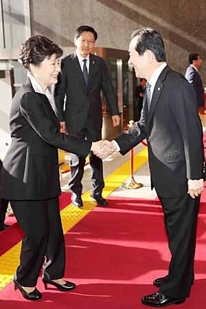 박근혜 대통령이 24일 오전 2017년도 예산안 시정연설을 하기 위해 국회에 도착, 정세균 국회의장의 영접을 받고 있다.