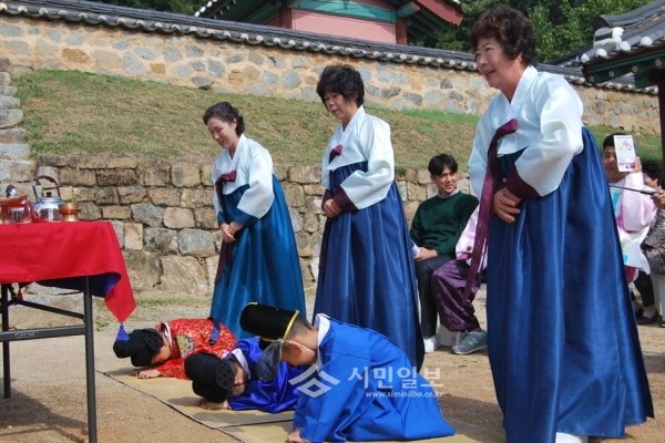 최근 경기 양평군의 국공립옥천어린이집 원아들이 지역내 양근향교를 방문해 전통혼례를 체험했다. 사진은 전통혼례 복장을 차려입은 어린이들이 절을 하며 체험을 진행하고 있는 모습.(사진제공=양평군청)