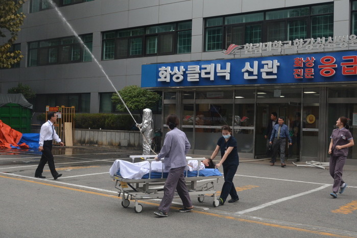 최근 영등포소방서는 영등포동 소재 한강성심병원에 대한 소방훈련을 실시했다. 사진은 화재사고에 대비해 화재를 초기에 진압하는 훈련과 환자이송이 진행 중인 모습.(사진제공=영등포소방서)