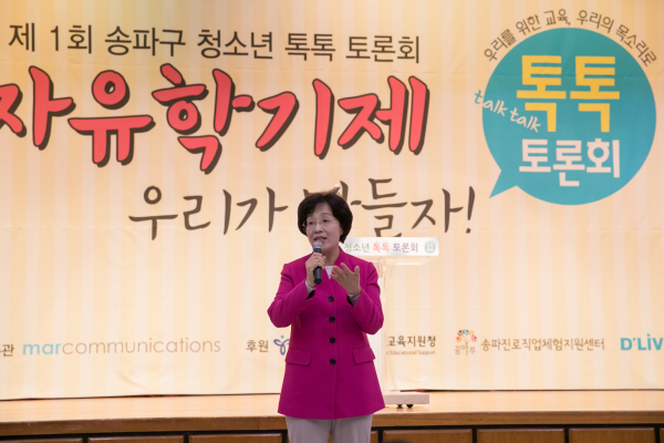 최근 서울 송파구청 대강당에서 ‘우리가 원하는 자유학기제’란 주제로 열린 ‘제1회 송파구 청소년 톡톡토론회’가 열렸다. 이번 토론회에는 100명의 청소년이 모여 모둠별 토론을 통해 올해부터 전면 시행된 자유학기제에 대한 솔직한 의견을 나눈다. 사진은 토론회에 참석한 박춘희 구청장이 인사말을 하고 있는 모습.(사진제공=송파구청)
