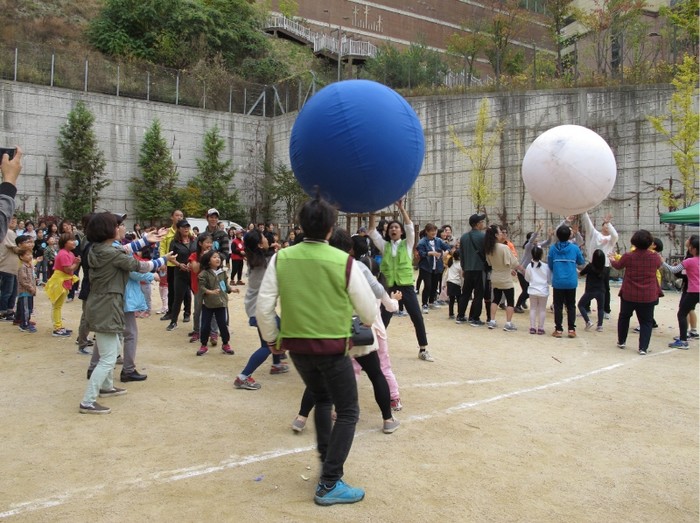 최근 서울 은평구는 드림스타트 아동과 가족 등 200여명이 참석한 가운데 서울연은초등학교 운동장에서 '가가호호 가을운동회'를 개최했다. 사진은 참가자들이 큰공넘기기 대항전을 진행하는 모습.(사진제공=은평구청)