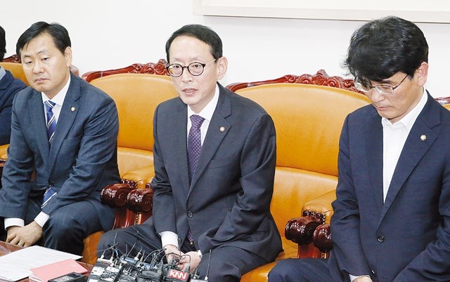 최순실 의혹 수사를 위한 특별검사 임명 협의를 위해 27일 오후 국회에서 만난 여야 3당 원내수석부대표가 대화하고 있다. (왼쪽부터) 국민의당 김관영·새누리당 김도읍·더불어민주당 박완주 원내수석부대표.