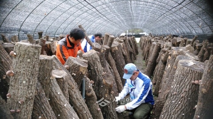 최근 충남 아산시 농업기술센터 기술지원과는 가을철 수확기를 맞아 자매결연 마을인 송악면 종곡리(느티장승 마을)를 찾아 농촌일손돕기 봉사활동을 펼쳤다. 사진은 직원들이 버섯 수확 및 선별작업을 돕는 모습.(사진제공=아산시청)