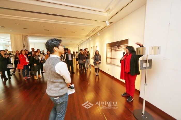 지난 27일 서울 금천구는 금나래아트홀갤러리에서 ‘예술, 다른 예술을 만나다’라는 주제로 사회적경제 패션봉제 사진전을 개최했다. 사진은 프랑스 유명 예술 사진작가인 울라 레이머(오른쪽)가 작품 설명을 하는 모습.(사진제공=금천구청)