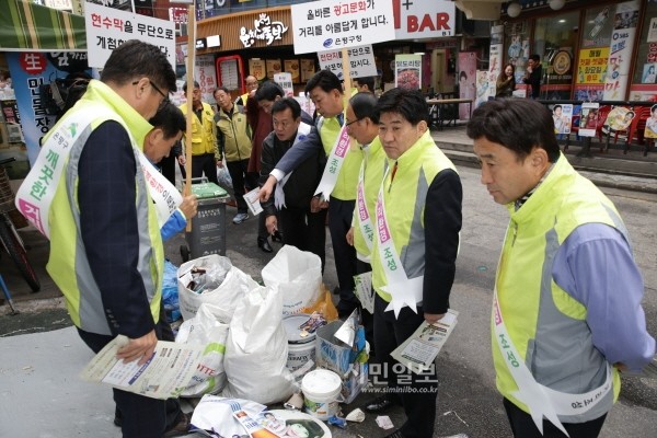| ▲ 깨끗한 거리문화 조성을 위한 환경정화 캠페인에 나선 성흠제 서울 은평구의장(오른쪽에서 네번째)과 구의원들이 거리에 방치된 쓰레기들을 지적하고 있다.(사진제공=은평구의회) | ||