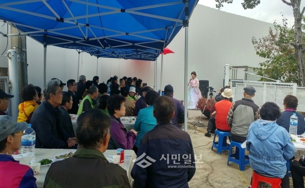 최근 경기 수원여성나눔회는 팔달구 고등동주민센터에서 지역내 홀몸노인들 70여명에게 손수 만든 갈비탕과 전, 과일 등 점심식사를 대접했다. 사진은 노인들이 식사를 하며 공연을 보는 모습.(사진제공=팔달구청)