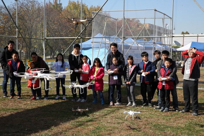 지난 30일 성동구는 서울숲내 곤충식물원 옆 잔디광장에서 지역내 초등학교 4~6학년과 중학생을 대상으로 드론청소년체험캠프를 개최했다. 사진은 정원오 구청장(오른쪽에서 일곱번째)과 학생들이 드론을 날리고 있는 모습.(사진제공=성동구청)