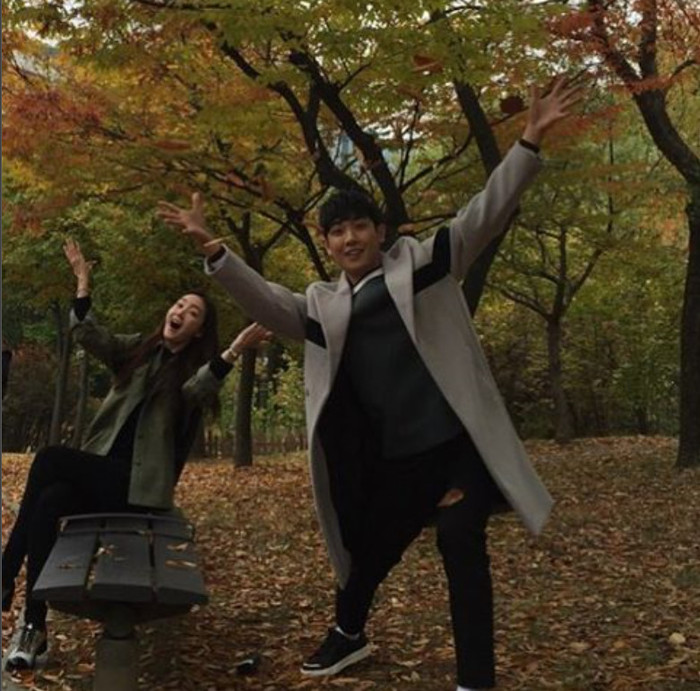 공개 된 사진 속 이들은 낙엽이 쌓인 벤치에서 카메라를 향해 두 팔 벌리고 활짝 웃는 즐거운 모습이다.