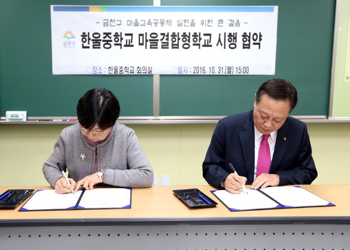 지난 31일 오후 3시 금천구는 한울중학교와 함께 학교시설 개방을 위한 마을결합형 학교 시행 협약을 체결했다. 사진은 차성수 구청장(오른쪽)이 박순식 교장과 협약서에 서명을 하는 모습.(사진제공=금천구청)