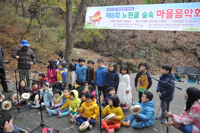 지난 29일 노원구 수락산 노월골 숲속 교실 야외 무대에서 노원공동육아사회적협동조합과 노원골 사람들이 주관해 '노원골 숲속 마을 음악회'를 개최했다. 사진은 어린이들이 합창 공연을 하고 있는 모습.(사진제공=노원구청)