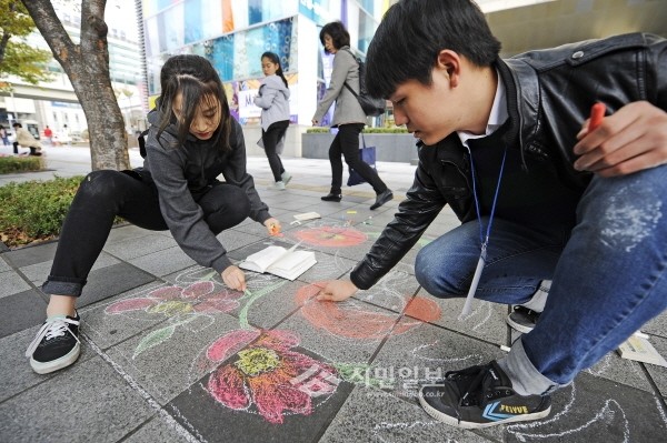 최근 (재)이 나루아트센터 광장 일대에서 '2016 제1회 뚝섬 팝아트 페스티벌'을 개최했다. 사진은 행사 참여자들이 바닥에 분필로 그림을 그리는 모습.(사진제공=광진구청)