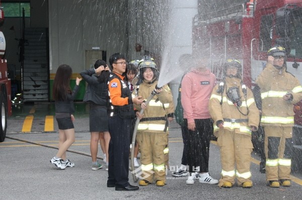 최근 경기 이천소방서는 송정중학교 '119소년단'을 대상으로 '미래 소방관 직업체험교실'을 운영했다. 사진은 학생들이 방화복을 입고 화재진압 체험을 하는 모습.(사진제공=이천소방서)
