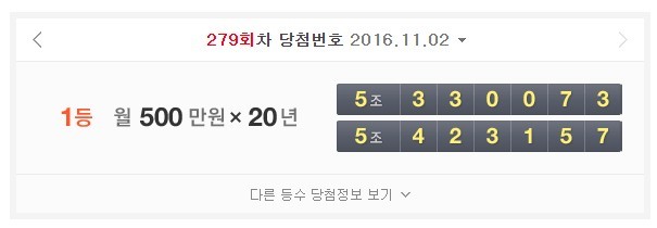 한편 279회 1등 당첨번호는 5조 330073번 5조 423157번이다.
