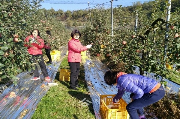 지난 2일 경기 여주시 대신면 주민자치위원회는 자매결연 자치단체 기관인 서울 중구 신당5동 주민자치위원회 위원들과 함께 지역내 인봉농원의 사과재배 농가에서 사과따기 봉사활동을 펼쳤다. 사진은 참가자들이 사과를 수확하는 모습.(사진제공=여주시청)