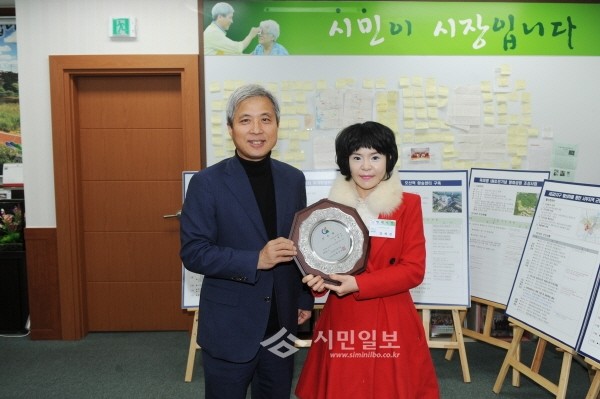 최근 경기 오산시는 민선6기 제24대 ‘1일 명예시장’으로 강세진헤어샵 대표 강세진씨(34·여)를 위촉했다. 사진은 곽상욱 시장(왼쪽)과 강씨가 명예시장 위촉패를 들고 기념촬영하는 모습.(사진제공=오산시청)