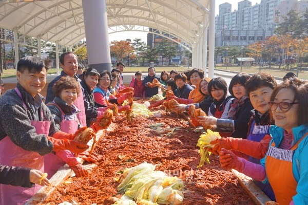 지난 2일 경기 양주시 회천2동 감동365추진협의체 시민감동분과는 덕계공원에서 50여명의 자원봉사자와 어려운 이웃을 위한 '사랑의 김장 담그기' 행사를 진행했다. 사진은 이날 참여자들이 김치를 담그며 기념촬영을 하는 모습.(사진제공=양주시청)