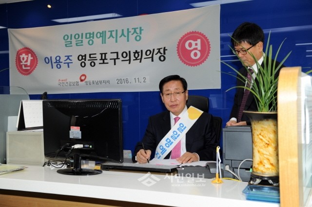 | ▲ 이용주 영등포구의장(왼쪽)이 국민건강보험관리공단 영등포남부지사에서 일일명예지사장 업무를 보고 있다.(사진제공=영등포구의회) | ||