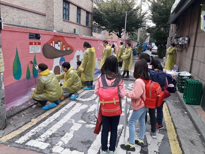최근 은평구 갈현초등학교 담장 130m에 롯데자산개발(주)의 임직원 150명이 사회공헌활동의 일환으로 벽화를 그려넣었다. 사진은 행사 참가자들이 벽화를 그리는 모습.(사진제공=은평구청)