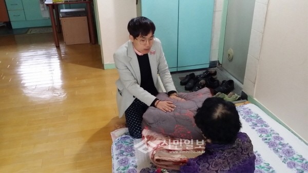 지난 3일 경기 동두천시 불현동행정복지센터는 질병, 장애 등으로 스스로 세탁을 하지 못하는 홀몸노인·장애인 5가구의 침구류를 소외계층 빨래방에 연계했다. 사진은 센터 관계자가 노인과 이야기를 나누는 모습.(사진제공=동두천시청)