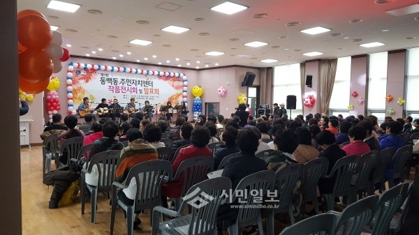 최근 경기 용인시 기흥구 동백동은 주민자치센터 수강생들이 동안 배운 강좌를 토대로 하는 작품전시회 및 발표회를 개최했다. 사진은 통기타 강좌생들의 발표가 진행되는 모습.(사진제공=용인시청)