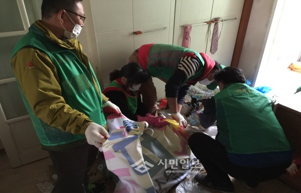 최근 서울 성동구 금호1가동은 '찾아가는 동주민센터 생활실태조사' 중 발견한 장애인가구에 가득 쌓인 쓰레기더미를 치우는 등의 대청소를 실시했다. 사진은 봉사자들이 집안 청소를 하는 모습.(사진제공=성동구청)