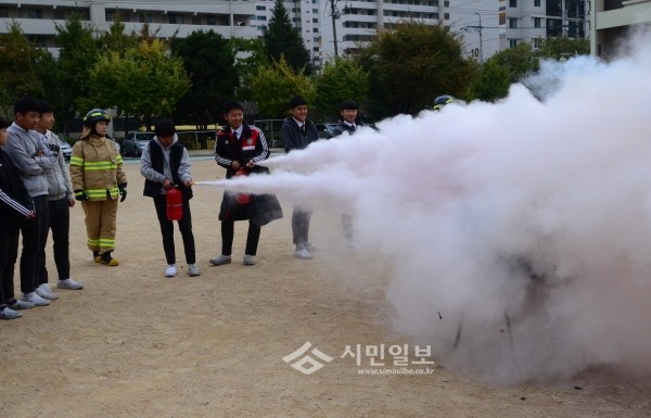 지난 4일 서울 영등포소방서는 문래중학교 운동장에서 '소방훈련'을 실시했다. 사진은 교육에 참여한 학생들이 화재가 발생한 것을 가상해 '소화기 사용실습'을 하는 모습.(사진제공=영등포소방서)