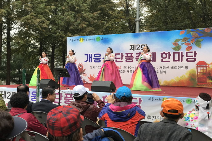지난 5일 구로구는 개웅산 배드민턴장에서 주민 400여명을 대상으로 '제2회 개웅산 단풍축제 한마당' 행사를 개최했다. 사진은 관람객들이 무대에서 펼쳐지는 축하 공연을 즐기는 모습.(사진제공=구로구청)