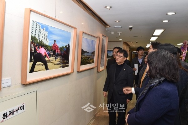 지난 7일 서울 노원구는 구청 2층 갤러리에서 ‘2016 노원사진작가회 정기전’을 개최했다. 사진은 김성환 구청장(왼쪽)이 관계자들과 함께 전시된 작품을 관람하고 있는 모습.(사진제공=노원구청)