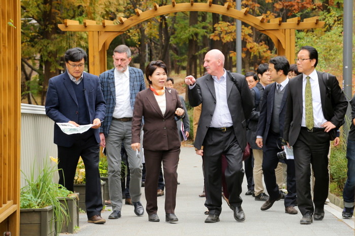 지난 7일 서초구에서 열린 ‘경부고속도 지하화 국제콘퍼런스’에 참석한 런던대 피터 와인 리스 등 4명의 도시계획 분야 세계적 석학 일행과 조은희 구청장(왼쪽 세 번째)이 해당 구간을 방문, 교통정체 원인 등을 청취하고 있다.(사진제공=서초구청)